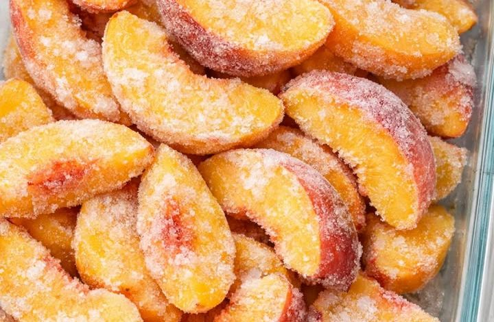 Dump rock-hard frozen raw peach slices in the casserole dish and 4 other basic pantry items to get a dessert so delicious your friends will be begging for more!