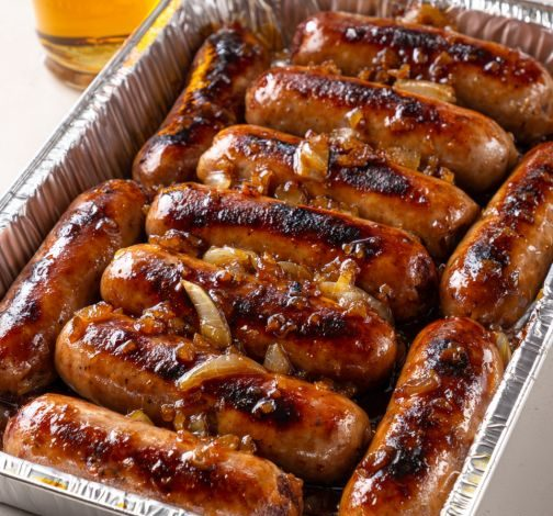 Place the sausages in a baking dish or rectangular foil pan, arranging them in a single layer so they cook evenly.