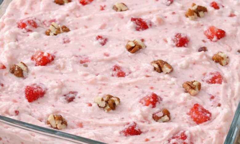 This 4-ingredient frozen strawberry fluff is one of those nostalgic, cool-and-creamy treats that feels like the perfect mix between a light mousse and a no-bake cheesecake. Creamy, fluffy, and packed with sweet strawberries, it stays soft enough to slice thanks to the whipped topping, while still giving you that refreshing frozen bite in every spoonful. Frozen Strawberry Fluff Ingredients 8 oz cream cheese, softened 2 cups whipped topping, thawed 2 cups fresh strawberries, diced ½ cup chopped pecans (plus a little extra for topping) ⅓ cup granulated sugar Directions In a bowl, beat the softened cream cheese with the sugar…