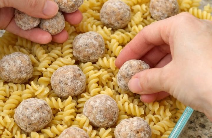 Spread frozen meatballs over uncooked rotini along with three additional ingredients in a glass baking dish to make a hearty meal that gets eaten up in no time.