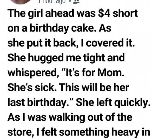 She didn’t argue. Didn’t ask for help. Just placed the cake aside with a quiet “thank you,” and turned away with a kind of acceptance that felt too heavy for someone her age. The Moment That Changes DirectionSometimes, you don’t think—you just act. I stepped forward and paid for the cake. She froze. Then looked up. What showed in her face wasn’t excitement. It was relief—deep, immediate, almost overwhelming. She hugged me without hesitation. “It’s for my mom,” she whispered. “She’s not feeling well.” There was no performance in it. No exaggeration. Just something honest. Then she left, carrying the…
